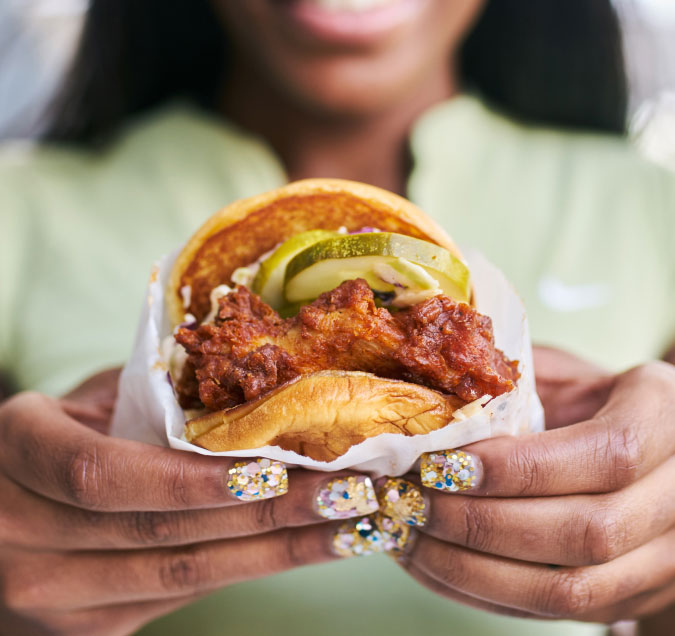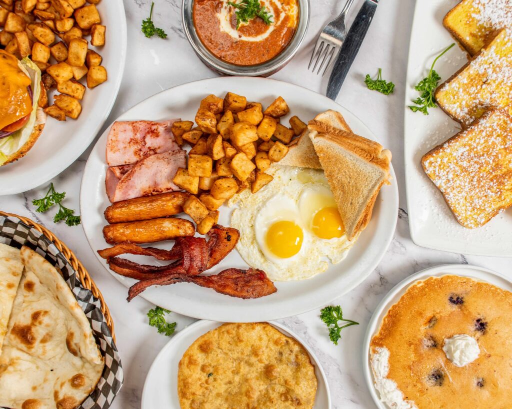 With scrambled eggs, tomatoes, mushrooms, green peppers, red onions, & spinach. Topped with 3 cheeses & served with a side of hollandaise.