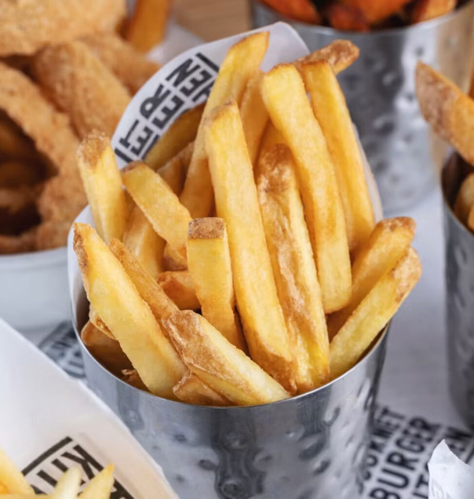With fresh bananas, strawberries, blueberries and apples. Served with whipped cream, finished with icing sugar.