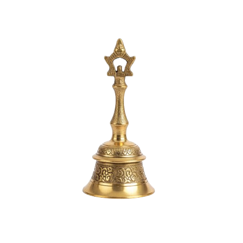 Bell, also known as Ghanti, is used in Hindu pooja rituals during aarti and prayers. Ringing the bell is believed to create positive vibrations and invite divine presence while removing negative energies.
